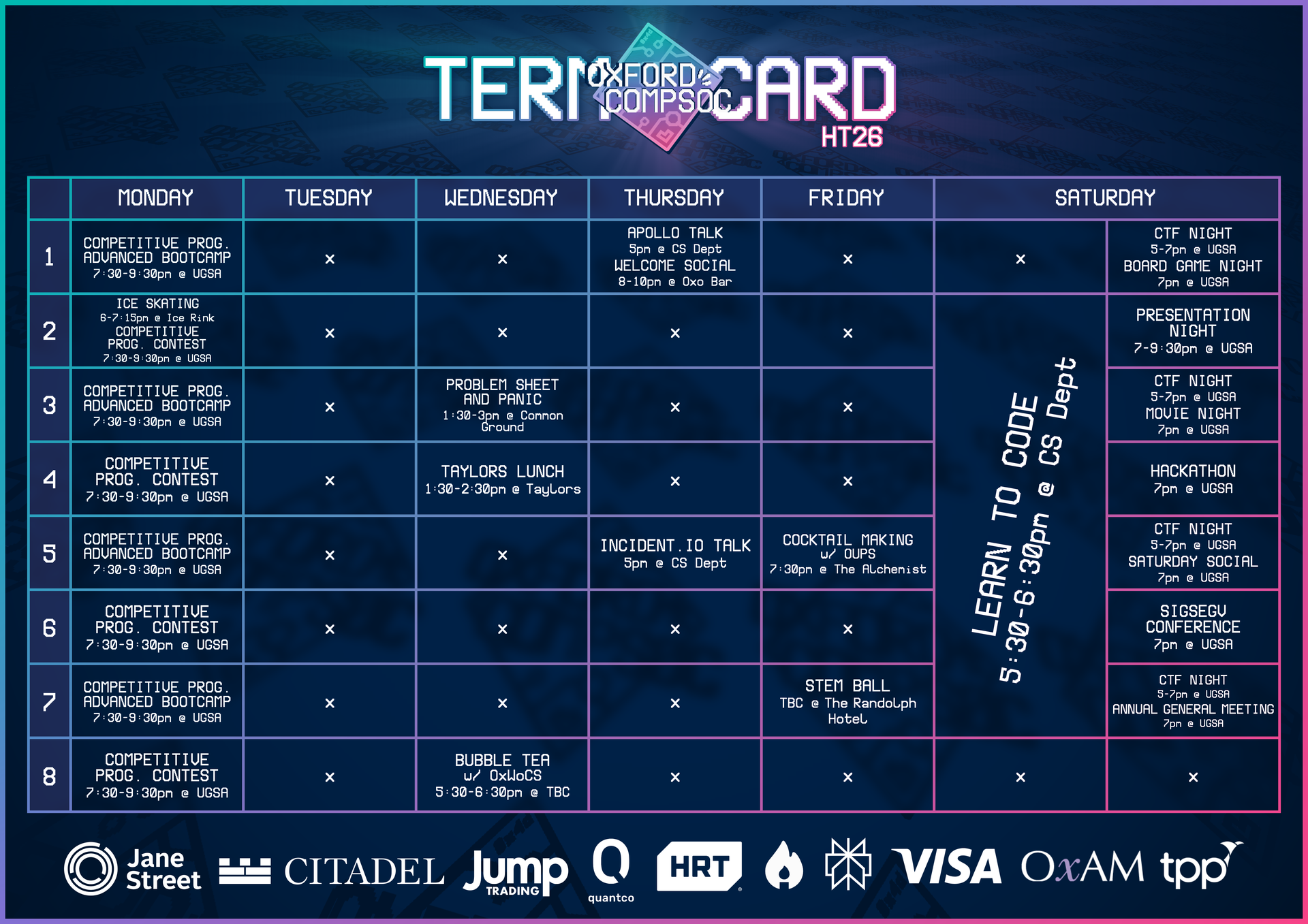 Say hello to our termcard for Hilary Term 2026! We have endless events in store for you this term, including talks, brand new competitive programming and CTF events, and the Saturday Socials we all know and love! We get started this Monday with our first advanced bootcamp for competitive programming, and wrap up on Wednesday of Week 8 with a bubble tea event.