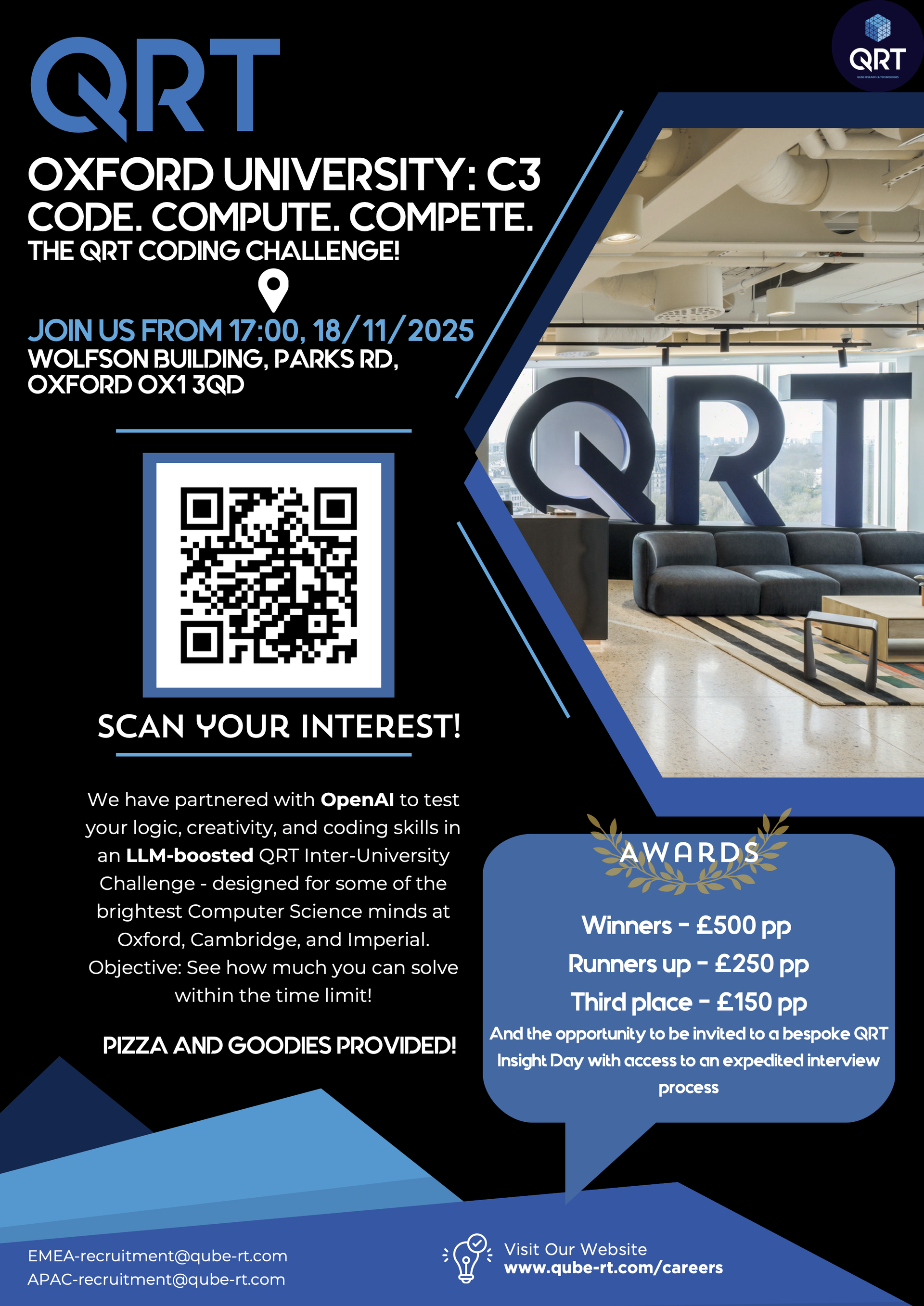 Next week, we'll be joining with our sponsors at QRT for a brand new opportunity! On Tuesday next week, we'll be playing host to QRT's C3 Coding Challenge at the Department of Computer Science, from 5pm onwards! Come along with teams of up to four and solve problems together!