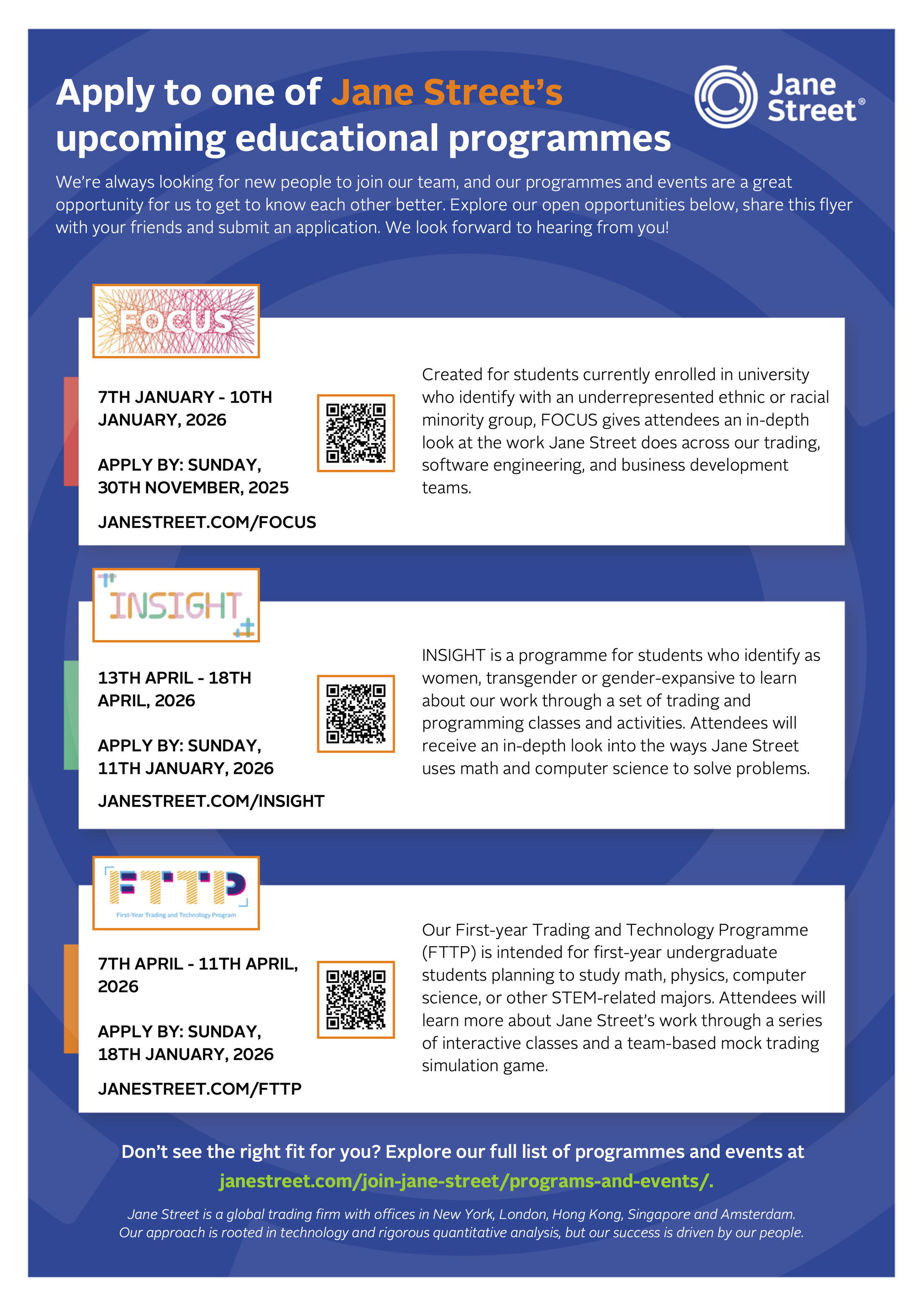 FOCUS<https://www.janestreet.com/focus-ldn-email>: (7 - 10 Jan in LDN) Created for students currently enrolled in university who identify with an underrepresented ethnic or racial minority group, FOCUS gives attendees an in-depth look at the work Jane Street does across our trading, software engineering, and business development teams. Jane Street will cover all travel expenses to and from London, including housing, meals, and a variety of social events throughout the programme. Deadline to apply is Sunday, 30th November.