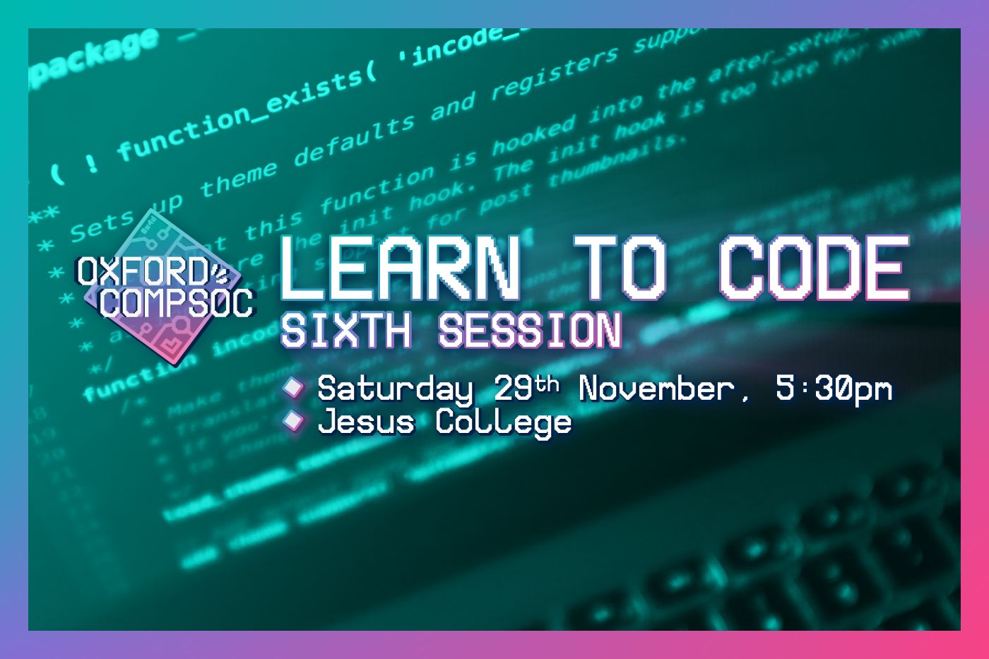 On Saturday, we'll first be partaking in the final Learn to Code session of the term! Make sure to come along from 5:30-6:30pm at Jesus College to round off your brand new skills.