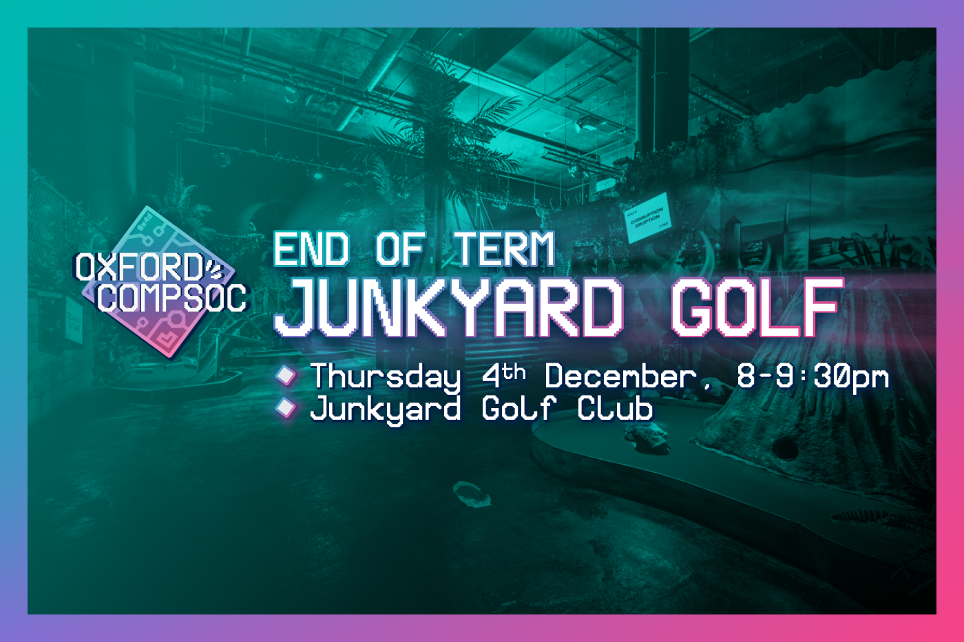 This Thursday, we're closing out Michaelmas Term with a bang! We'll be holding our final scheduled social this week at the Junkyard Golf Club from 8-9:30pm. If you're interested in a bit of a different evening from CompSoc's usual fare, make sure to sign up below, as spaces are limited! We'll let you know whether you have a place by the end of the day on Wednesday.