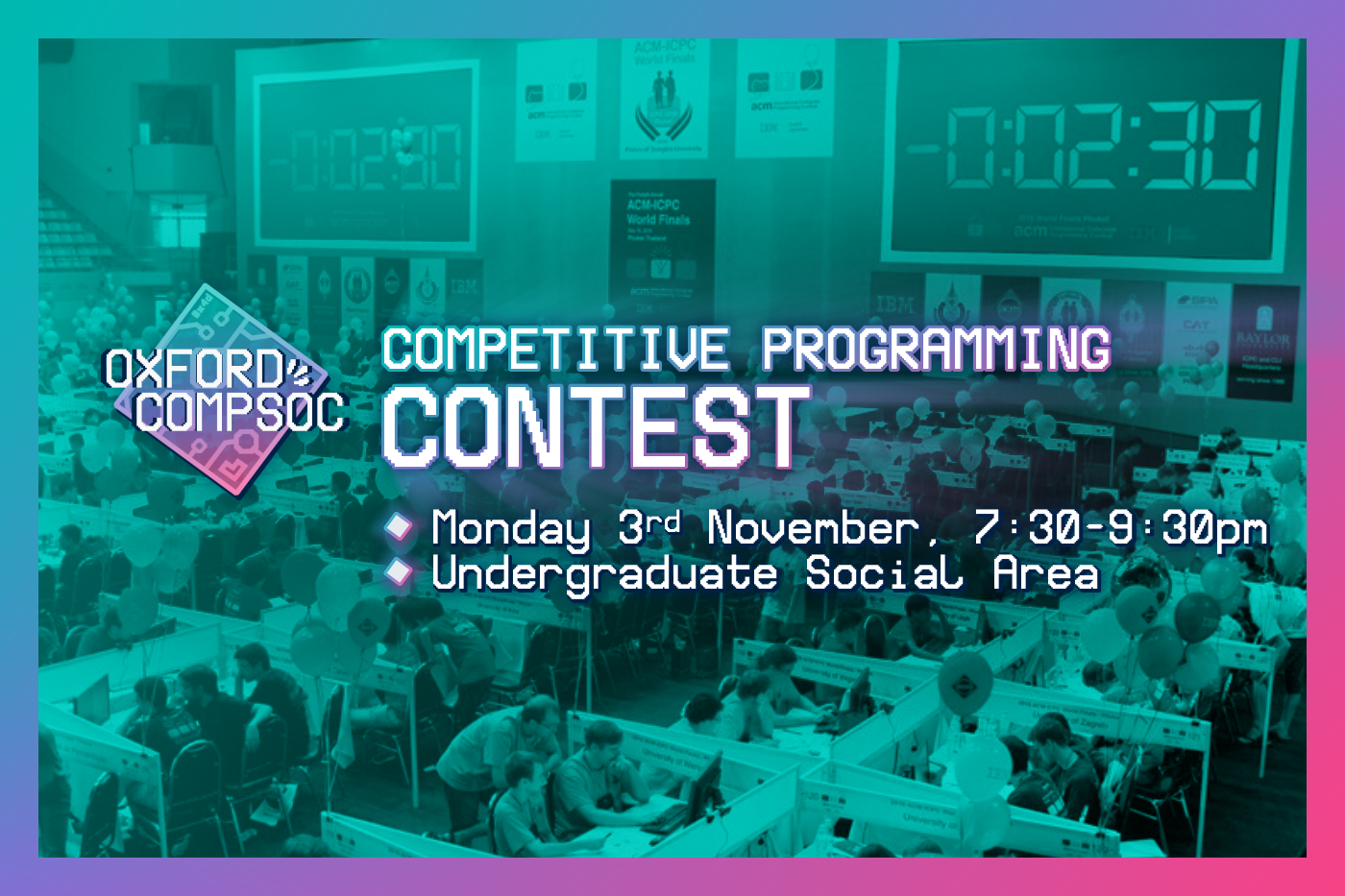 To kick the week off, we're down in the Undergraduate Social Area on Monday for a good old session of Competitive Programming! Make sure to join us at 7:30pm for our third contest of the term.
