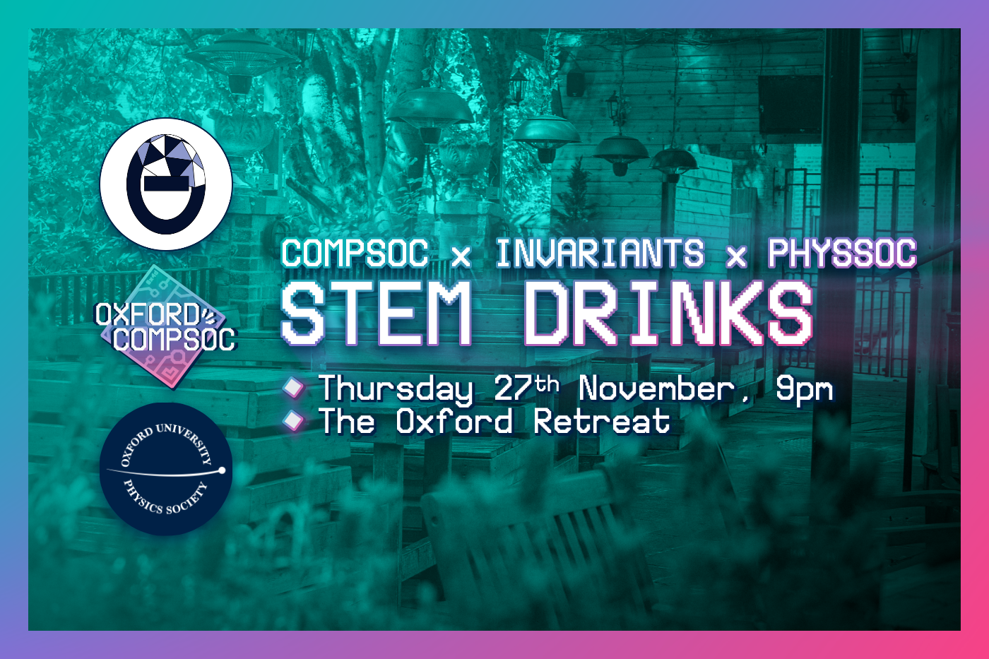 Ready to socialise with other STEM folk? No? Too bad! This Thursday, we'll be joined by our friends in the Invariants and the Physics Society to see out the (near) end of the term in style! We'll be at the Oxford Retreat from 9-11pm, imbibing free drinks and enjoying scintillating conversation through the evening. If you're interested in free drink tokens, make sure to sign up<https://docs.google.com/forms/d/e/1FAIpQLSe6ZaDejDcymJwpWSV3gQpPgJ4yq24TFP-…> in advance — tokens are limited!