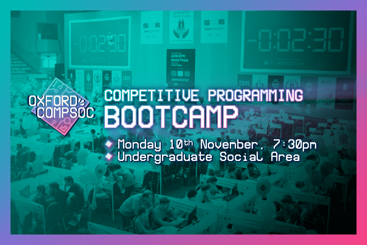 Now for the events! This Monday, we have yet another competitive programming bootcamp! Whether you're looking to get into competitive programming for the first time or hone your skills, come along from 7:30-9:30pm in the Undergraduate Social Area.
