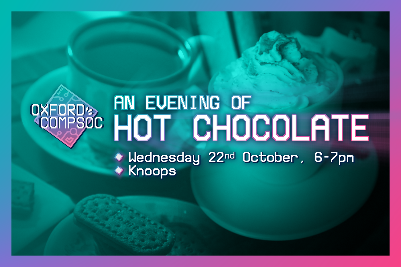 Amongst the hurly-burly of talks and contests, take a moment to relax with us this Wednesday! We'll be headed down to Knoops on Wednesday evening to sip some free hot chocolate and converse from 6-7pm. If you fancy a more chilled out social, come along and join us!