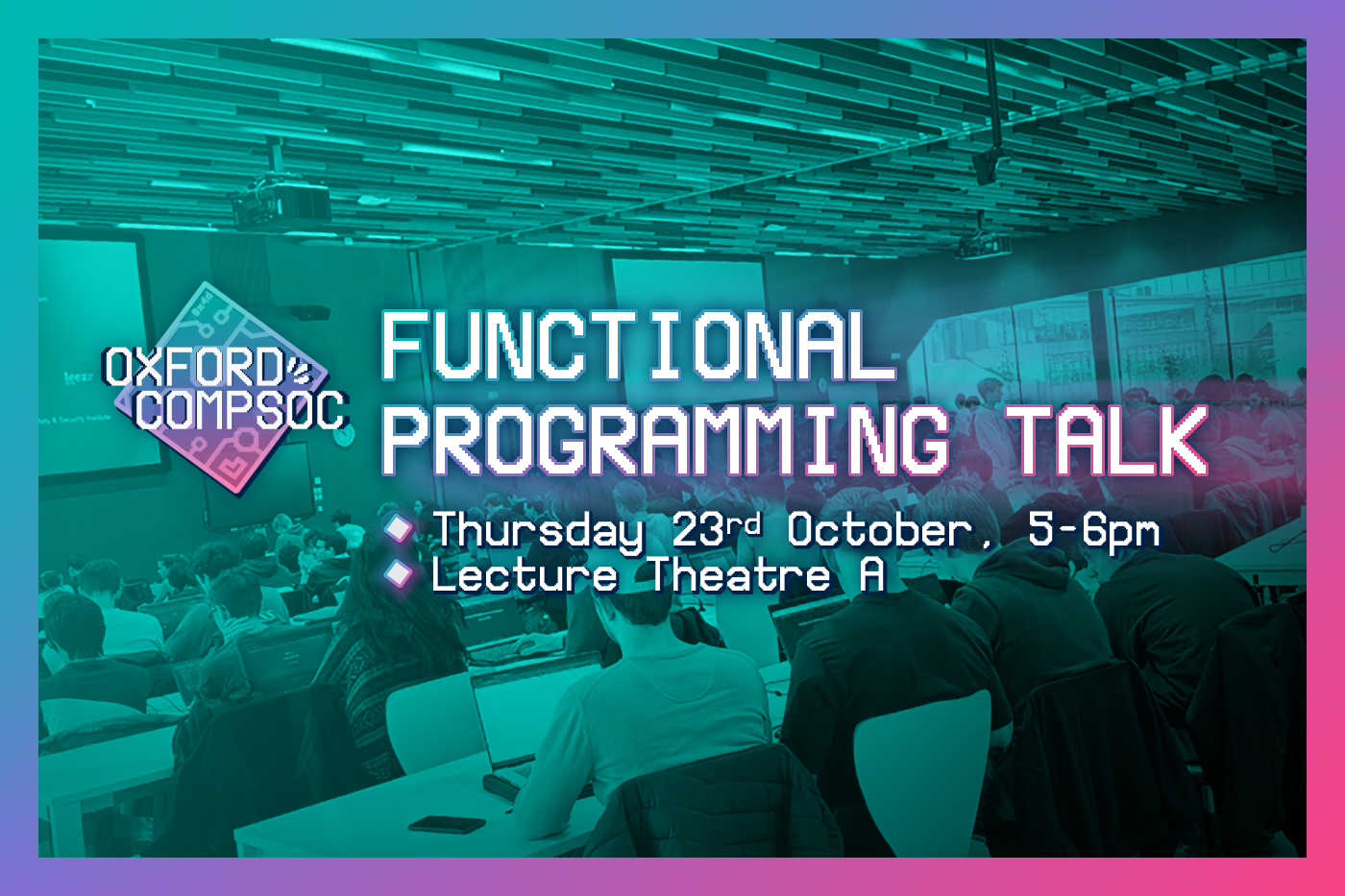 This Thursday, we're kicking off our array of student talks this term with an ever-relevant topic — functional programming! Join us this week in the Department's Lecture Theatre A from 5-6pm for a fascinating talk, after which we'll enjoy the classic CompSoc staple of free pizza. Don't miss it!