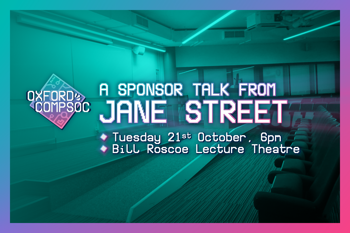 This Tuesday, we have our first sponsor talk of the year! We'll be joined this week by our sponsors at Jane Street in the Department's Bill Roscoe Lecture Theatre for a surely scintillating talk. If you're interested in Jane Street's work or are thinking about careers, make sure to come along at 6pm!