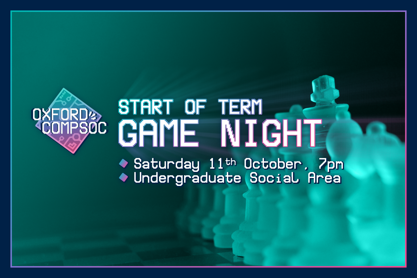 Curiously for a Week 1 newsletter, our events begin this Saturday (today!) with our traditional game night! Head on down to the Department of Computer Science's Undergraduate Social Area at 7pm to play a bonanza of games, meet new people and, most crucially, enjoy our ample free pizza and snacks.