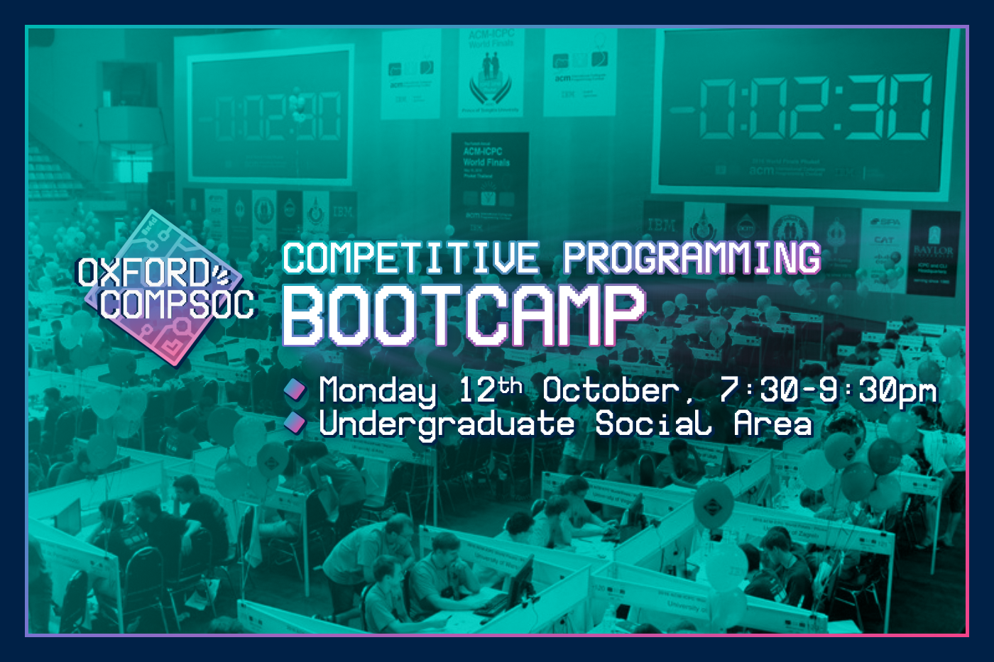 As the term begins, we'll be back in the Undergraduate Social Area on Monday for the first of our competitive programming bootcamps! If you're interested in battling against your peers but don't have any competitive programming experience, come along at 7:30pm!