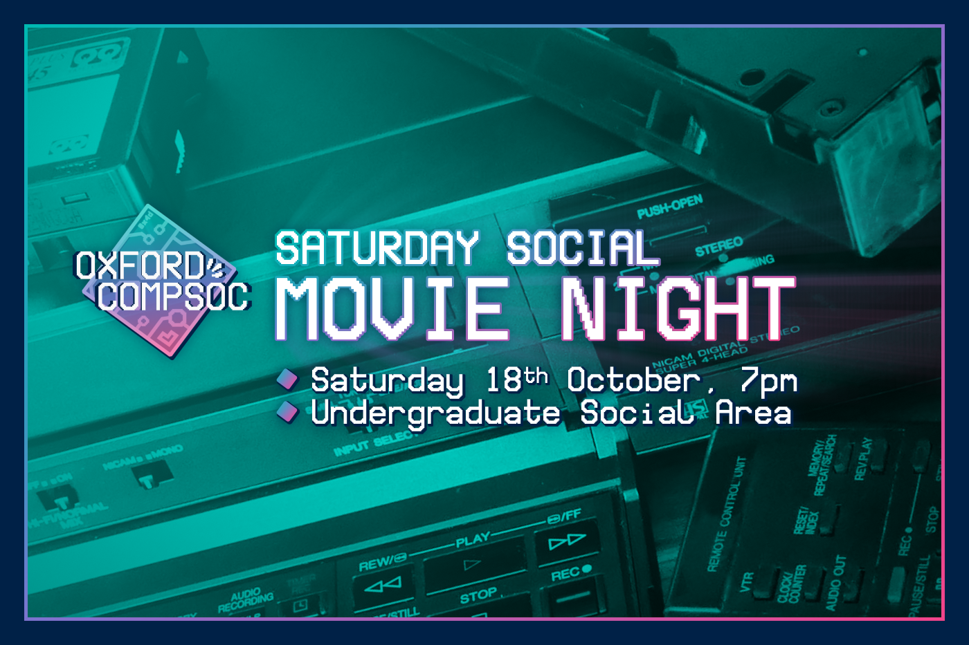 It's the end of the week at last, and what better way to relax than with a movie? This Saturday, we're headed down to the Department's Undergraduate Social Area at 7pm for a good old movie night — we'll be watching a film of your choice, accompanied with the usual CompSoc trimmings of free snacks and pizza. You won't want to miss it!